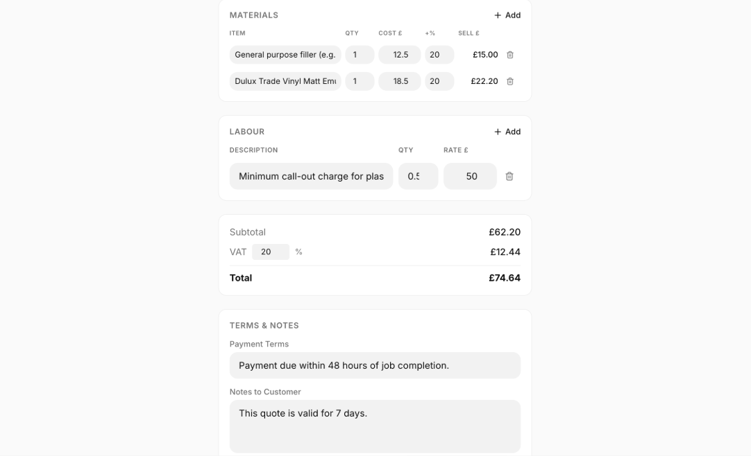 Stop losing money on outdated material costs. Upload your own CSV price list from your preferred London suppliers. Linkeasy uses your actual costs and your specific markup to ensure every quote is profitable.